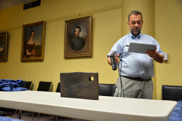 The American Civil War Museum is interested in exploring the possibilities of incorporating 3-D-printed artifact replicas into its educational programming. As Means scanned the CSS Virginia test plate, Hancock said a 3-D-printed replica would be useful to allow visitors to handle, even though they wouldn’t feel the full weight of the artifact.