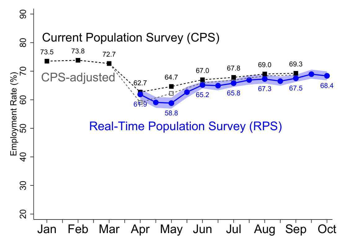 “In early October, 68.4% of working-age adults were employed,” Blandin said. “This is a large improvement compared to roughly 60% employment in April. But the current rate is still far below the 73.8% employment rate from February, just prior to the pandemic.”