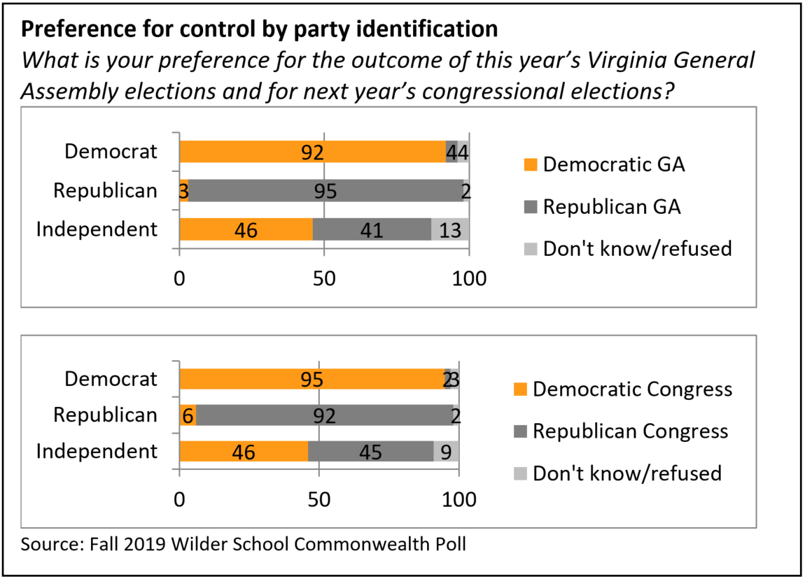 Those in Northern Virginia and the Tidewater region were more likely to prefer Democratic control of the General Assembly, with 58% and 53% respectively, while those in the Northwest and West were more likely to favor Republican control, with 61% each. The South Central region was fairly evenly split, with 48% favoring Democratic control and 45% favoring Republican control. Women, minorities and those with a college degree were more likely to prefer Democratic control of both the General Assembly and Congress.