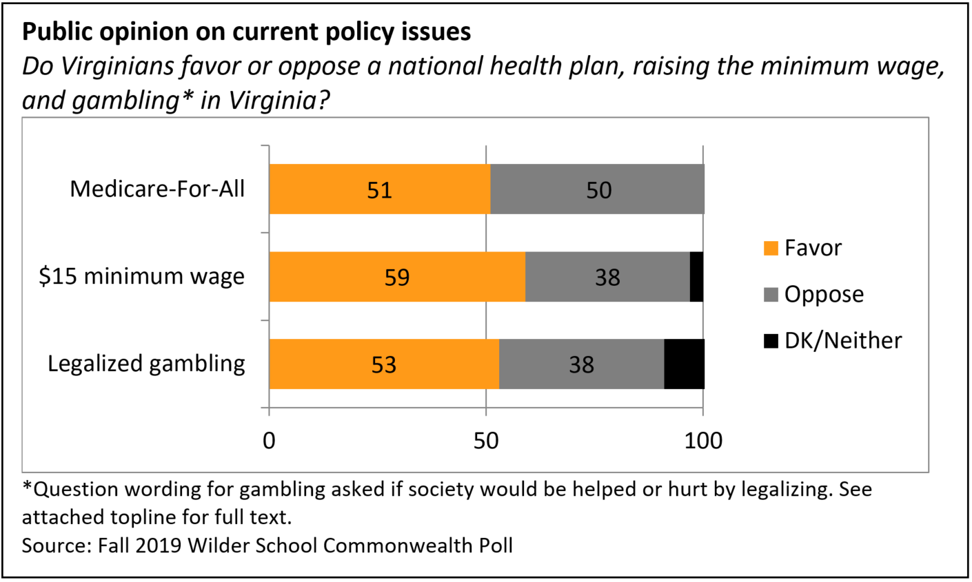 The poll also asked about support for three policy options: Medicare-for-all, raising the minimum wage and legalizing gambling. A majority of respondents were supportive of all three. Virginians were nearly split when asked if they favored or opposed Medicare-for-all, with 51% strongly or somewhat favoring and 26% strongly favoring. Family income was a significant factor with 32% of those making less than $50,000 per year strongly favoring Medicare-for-all and another 38% somewhat favoring it. Seventy-one percent of minorities strongly or somewhat favored the option, with 37% strongly favoring it, compared to 39% of whites saying strongly or somewhat. The partisan divide was strong: 44% of Democrats strongly favor the measure, and 62% of Republicans strongly oppose it.