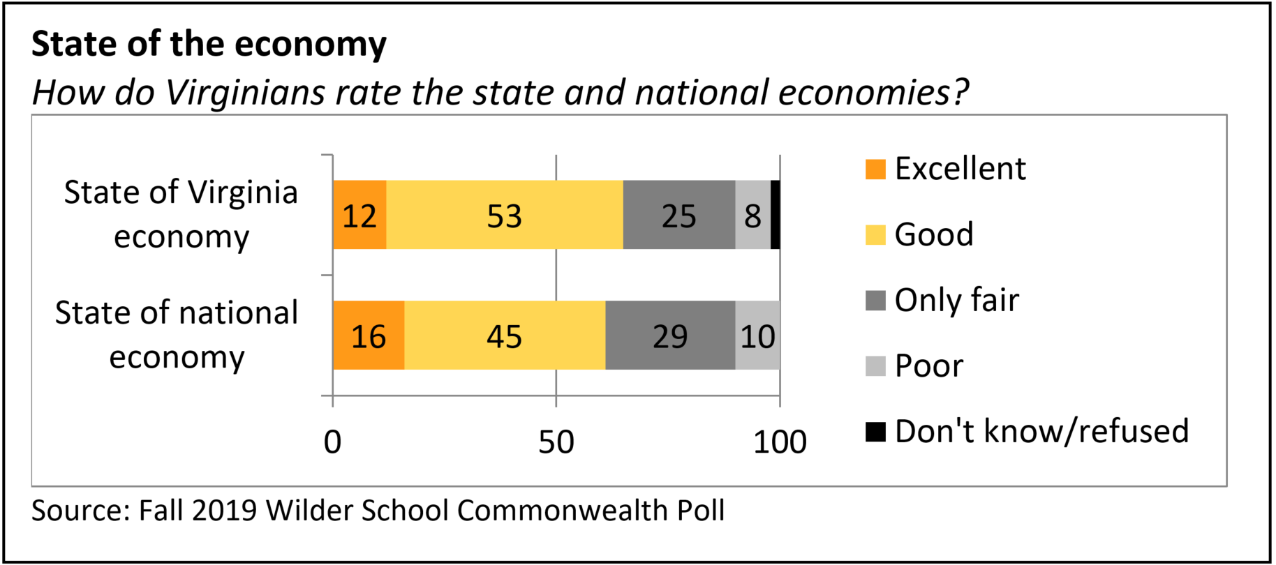 Respondents were slightly more positive when asked about Virginia’s economy, with 65% saying it was excellent or good and 33% saying only fair or poor. Income, race and party identification were significant again. However, those making less than $50,000, minorities and Democrats were more positive about the Virginia economy than the U.S. economy. Forty-eight percent of those making less than $50,000 a year said the Virginia economy was excellent or good, compared to 66% of those making $50,000-$100,000 and 84% of those making $100,000 and more. A majority of minorities (57%) rated the economy as excellent or good and 70% of whites said the same. And a majority of Democrats (53%) gave the positive rating of excellent or good, compared to 77% of Republicans and 66% of independents.