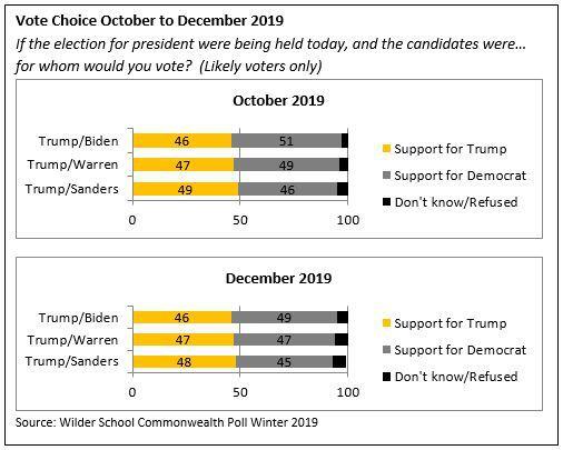 - Support for the Democratic 2020 frontrunners has shifted with likely voters since the Wilder School’s October poll. Biden is still ahead of Trump by 3 percentage points (49% versus 46%). Warren is evenly split, with both receiving 47%. And Trump is ahead of Sanders by 3 percentage points (48% versus 45%).
