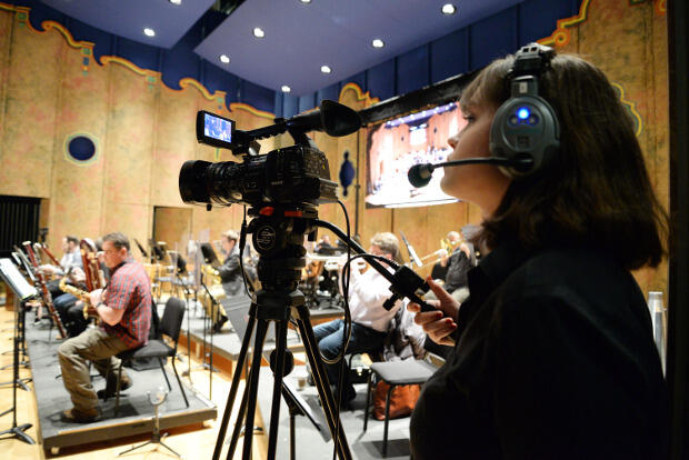 Devon Eifel, a junior broadcast journalism major in the Robertson School, is part of the crew of VCU students. She will be stationed on a riser, manning a camera to get video of the conductor, the nearby percussion section and a wide shot of the orchestra.