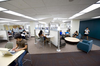 At the James Branch Cabell Library on the Monroe Park Campus, students have a variety of places to settle with the amenities they require nearby. It has considerable space dedicated to collaborative and partnership work allowing students to work together with the seating and technology they need to complete their academic assignments. In addition to space where people can work together in smaller groups while not disturbing others, an entire floor is designated as silent for students who need absolute quiet for their academic work.