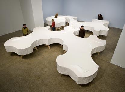 At ground level, visitors can walk alongside and within the table, enjoying a sense of being part of a desolate, wintry landscape. Following one curling movement on the table to its end brings a visitor to feel trapped in chest-high snow.