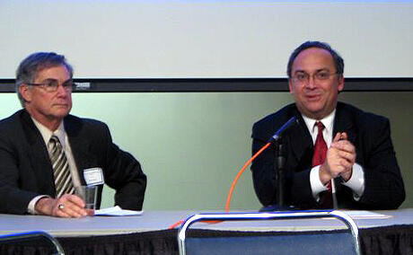Hugh Keogh (above left), president of the Virginia Chamber of Commerce, and Bill Pantele, a member of the Richmond City Council, discuss the likely impact of the financial downturn on localities, counties and the state on Jan. 8 at VCU.