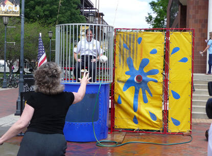 Participants were given the option of buying tickets to take a chance at knocking the officers into the water by throwing balls at the target or paying $10 to walk up and hit the target with their hands.
