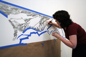 The drawings require careful planning – Ross utilized tape to map out a path for her installation piece on the gallery’s walls – but also the flexibility to change course when something surprising emerges in the process. For instance, a drawing in the exhibition, “Unicursal Reverie No. 1,” features the silhouette of a boy, who appears to be enjoying the view near a cliff’s edge. Ross said the boy began to appear to her surprise while she was drawing the work, and she scrapped her previous plans in order to fulfill what was developing.