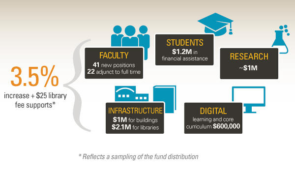A substantial amount of the revenue realized from the tuition increase will be used for new faculty, adding 41 new positions and converting 22 adjunct positions to full-time. In addition, $1.2 million will be earmarked for financial aid to students.