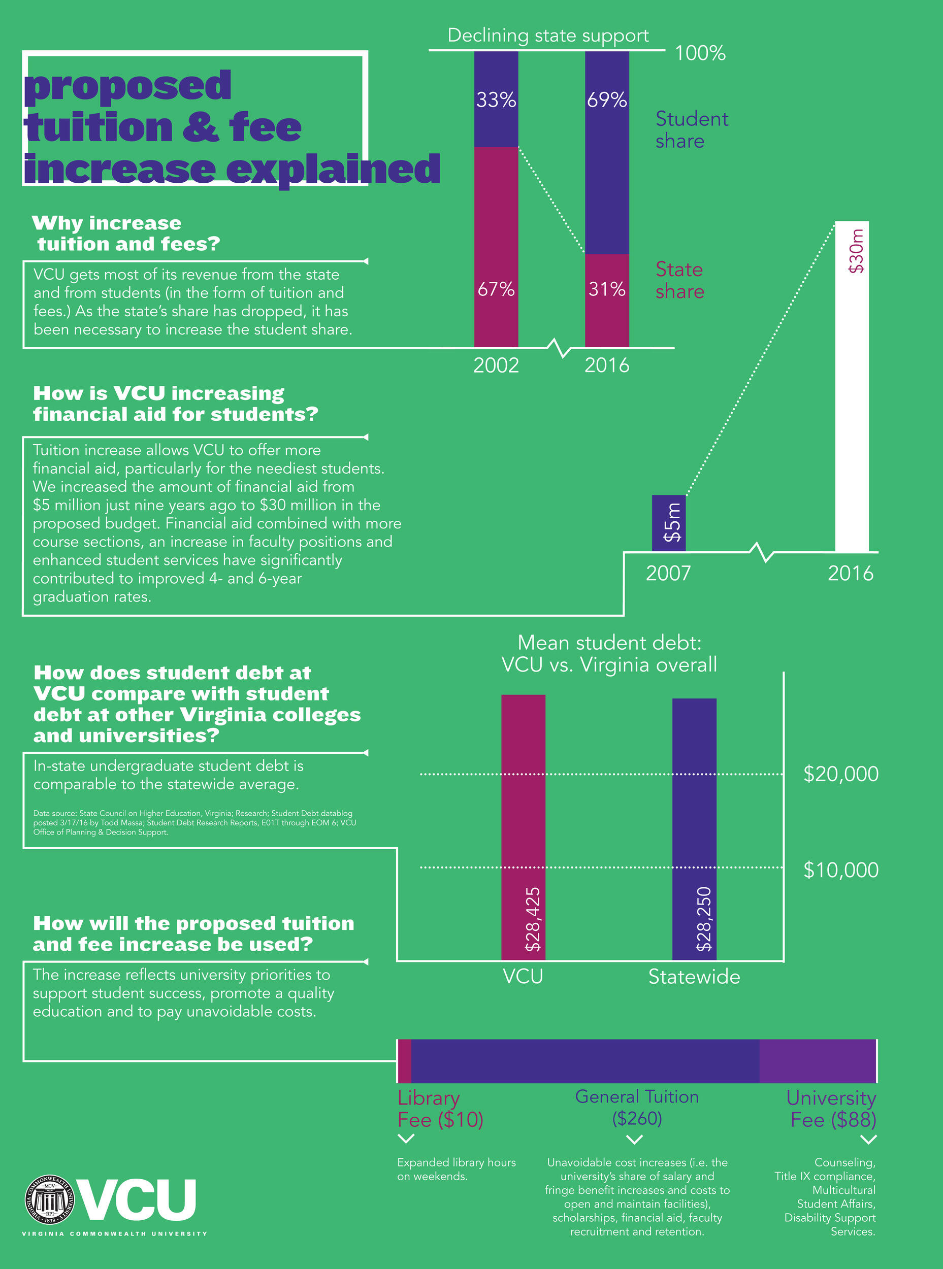 The total increase in tuition and mandatory fees for in-state undergraduate students would be $358, a 2.8 percent increase, from $12,772 to $13,130. An increase in financial aid would be used to offset the tuition and fees increase for students with demonstrated financial need. In an email message to students, Rector John Luke Jr. wrote, “The Board of Visitors recognizes that this is an extremely busy time of year but wanted to provide an opportunity for further discussion about the university’s proposed budget, including the proposed increase in tuition and fees.”