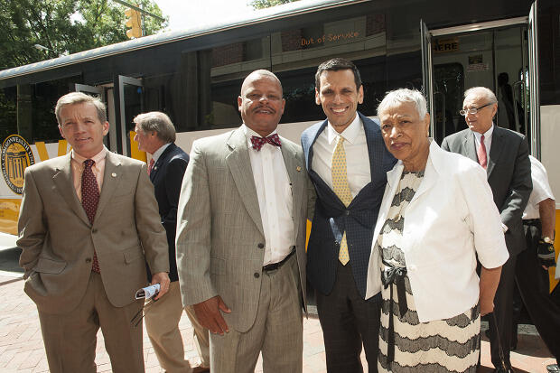 Featured image at top: From left: Del. Chris Jones, chairman of the House Appropriations Committee; Del. Luke E. Torian; VCU President Michael Rao, Ph.D.; and Del. Mayme E. Bacote step off the bus after taking a tour of VCU's campuses.