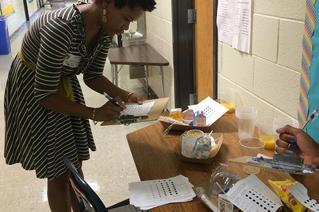 Feature image at top: Rachel Boutte, a counseling psychology graduate student at VCU, rates how much fruit and vegetables remain on students' plates in a Chesterfield County elementary school.