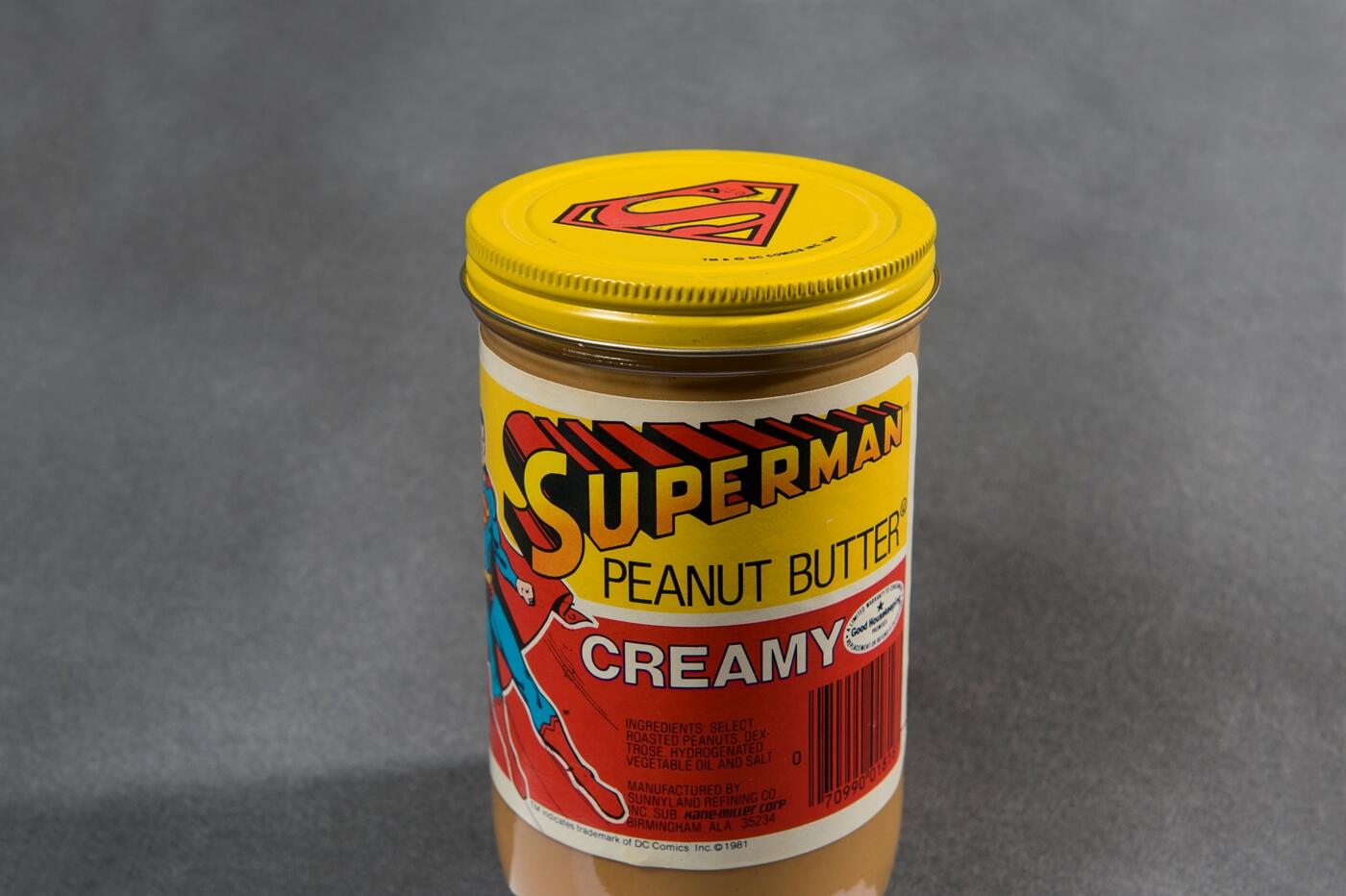 This jar of Superman peanut butter from 1981 is another ephemeral piece in the collection.