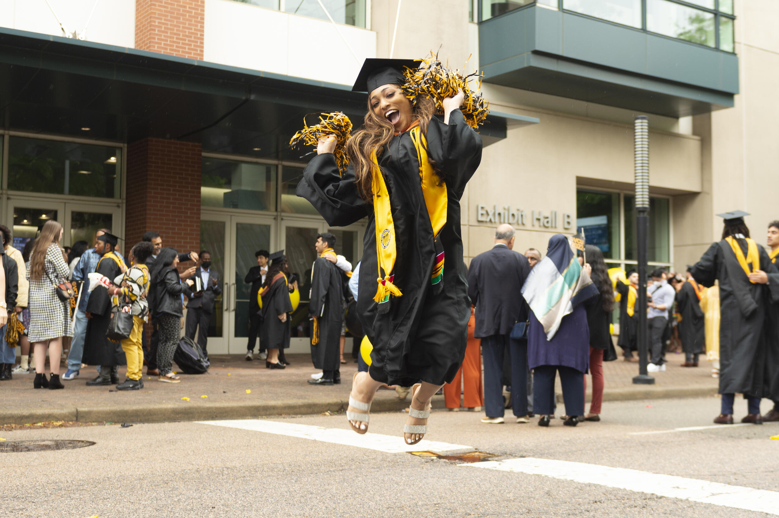 May commencement is the university’s largest event of the year, and it requires extensive planning and coordination by a dedicated team. It also requires a bit of flair to make sure the atmosphere is suitably festive. Some of the features to look for include: