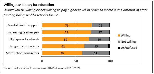 - Two-thirds of Virginians believe public schools are underfunded and majorities are willing to pay more for specific improvements. Sixty-six percent thought funding was not enough to meet public schools’ needs, while only 27% thought it was enough. More than 7-in-10 Virginians were willing to pay more in taxes to increase mental health services for students and to increase teacher pay (73% and 72%, respectively). Sixty-nine percent would pay more to increase funding to high-poverty, underperforming schools. Respondents were slightly less willing to pay for increasing community programs to help improve student achievement (62%) and hiring more school counselors (59%).