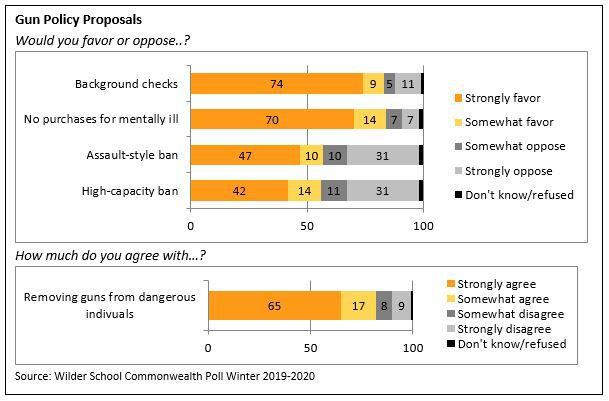 Ahead of the General Assembly session that starts tomorrow, a majority of Virginians favor stricter gun laws, with large majorities supporting background checks, limits on gun ownership for those with mental illness, and red flag laws, according to a statewide poll conducted by the Center for Public Policy at the L. Douglas Wilder School of Government and Public Affairs at Virginia Commonwealth University.