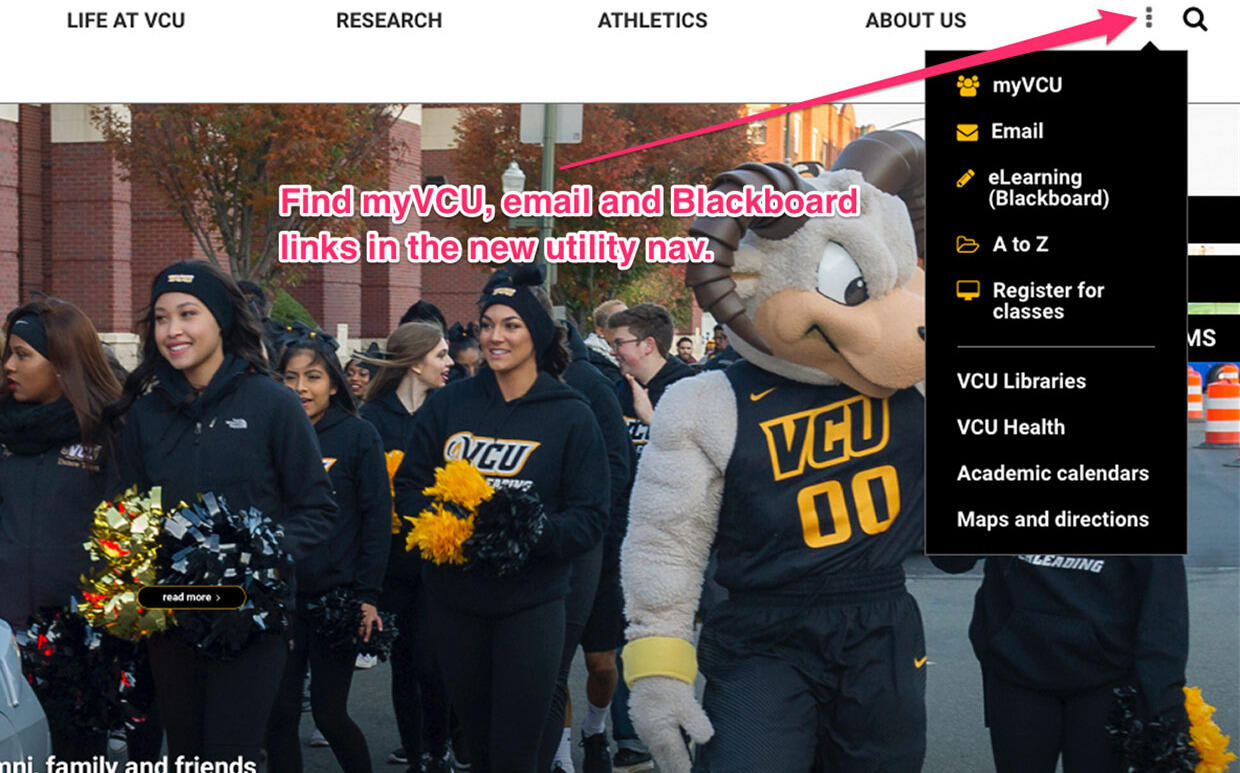 Where’s the email link? How about Blackboard and myVCU? The tools that students, faculty and staff often come to the home page for are listed in the “utility nav” that you see when you hover over (or tap, on touch devices) the three dots on the right side of the main navigation.