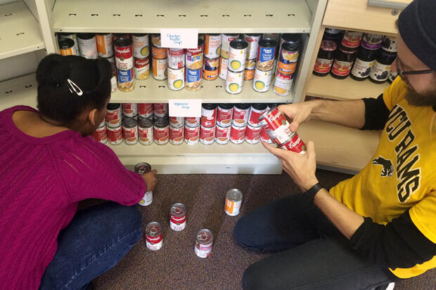 Feature image at top: Crystal Rawls, junior in the Richard T. Robertson School of Media and Culture, and Kirk Leppert, junior English major, stock canned goods at Ram Pantry, VCU's student food pantry.