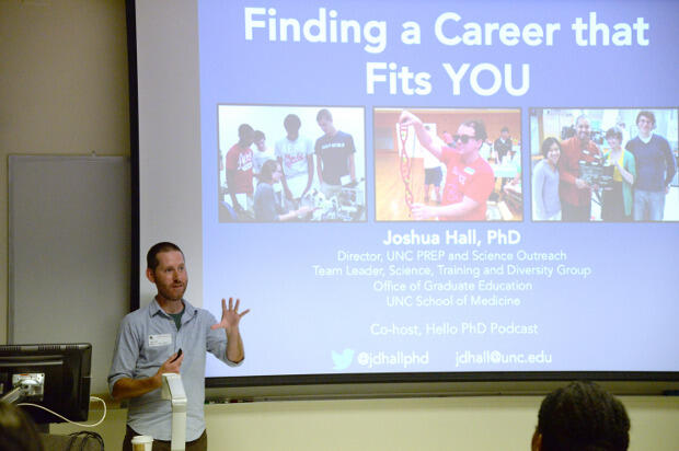 Hall, who serves as director of the postbaccalaureate research education program at the University of North Carolina at Chapel Hill, advocated for students to spend time self-reflecting on their personal interests when thinking about their career options.