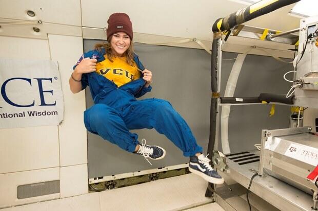 Feature image at top: Allison Bills shows off her VCU T-shirt while floating in a zero gravity flight.