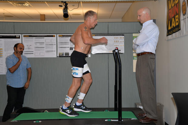 Williams began by taking extensive measurements of Plaskon. He measured his lower extremities, including his feet, to make sure everything measured evenly on both sides. He then measured his flexibility. After the measurements, it was time for Plaskon to step on the treadmill for the 3-D running test.