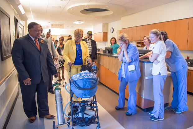 For most of the morning, the couple basks in the joy of the day as streams of hospital staff visit to say goodbye to Kaleb. “Kaleb’s care has been a team effort between them and us,” neonatal intensive care nurse Godbolt says.