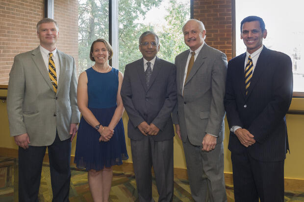 Feature image at top: From left: Thomas Eissenberg, Ph.D., Sally Hunnicutt, Ph.D., Ananda Pandurangi, M.D., and Gordon Ginder, M.D., were recognized by VCU President Michael Rao, Ph.D., during the 33rd annual Opening Faculty Address and Convocation.