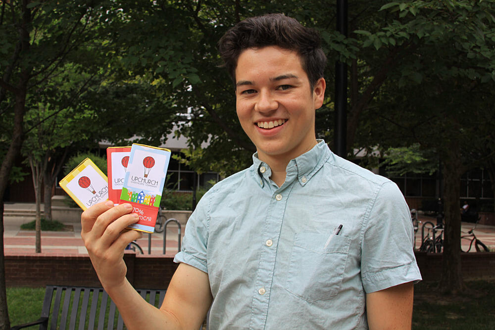 Featured image up top : Alexander Burlingame, a senior philosophy major, displays his company's first three chocolate bars, which are poised to hit to the market in Richmond.