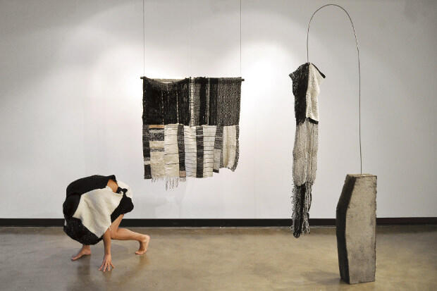 Each strand in Jeanne Medina’s textiles has a distinct identity. Her latest pieces use contemporary Japanese weaving techniques and rayon raffia strands that emulate tropical African fibers. They’re also fashion objects that come to life on the bodies of performers strutting and dancing across a gallery room.