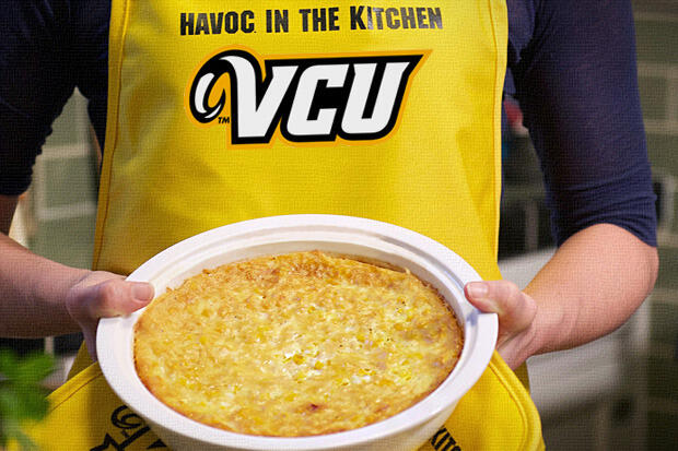 Pour mixture into 2-quart or larger baking dish. Bake until the corn pudding is completely set, about 1 hour and 20 minutes (or longer). If the top is getting beyond golden brown and the center is not set, cover with foil and reduce temperature to 300 and continue to cook, monitoring frequently. When serving, grind some fresh black pepper or sprinkle black sea salt onto the pudding to give it a particularly VCU look.