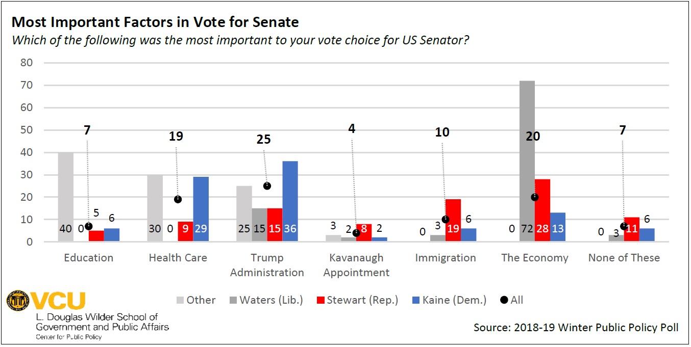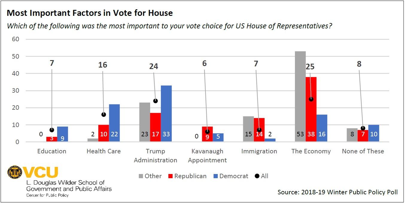 Offered a range of six issue areas, a 25 percent plurality of those who reported casting ballots in November said the most important factor driving their vote for Senate was responding to the Trump administration. A 24 percent plurality said the same about their vote for the U.S. House of Representatives, according to the Winter 2018-19 Public Policy Poll conducted by the Wilder School’s Center for Public Policy.