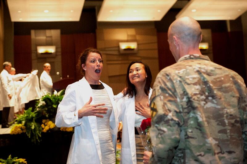 They show VCU School of Dentistry student Amy Moody on an already emotional day in the moments following the surprise homecoming of her husband, Sgt. 1st Class Terry Moody, who has been on active duty in the United States National Guard. He arrived unexpectedly from his fourth and final deployment this week at the VCU School of Dentistry’s white coat ceremony.