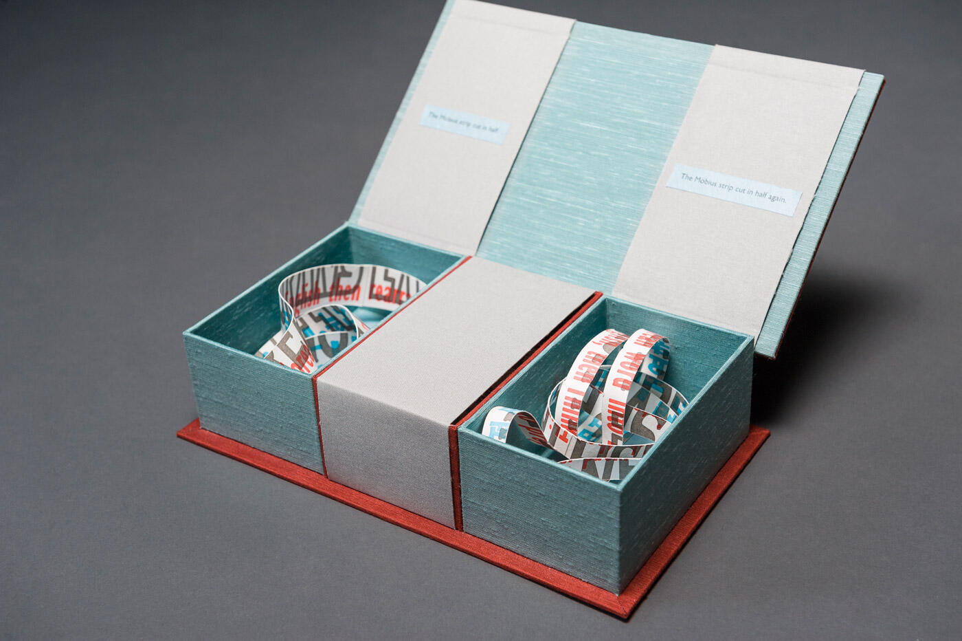“Language Möbius” is a magic wallet box that uses a Jacob’s Ladder-style binding and construction. Three compartments contain Möbius strips with English and Korean text.