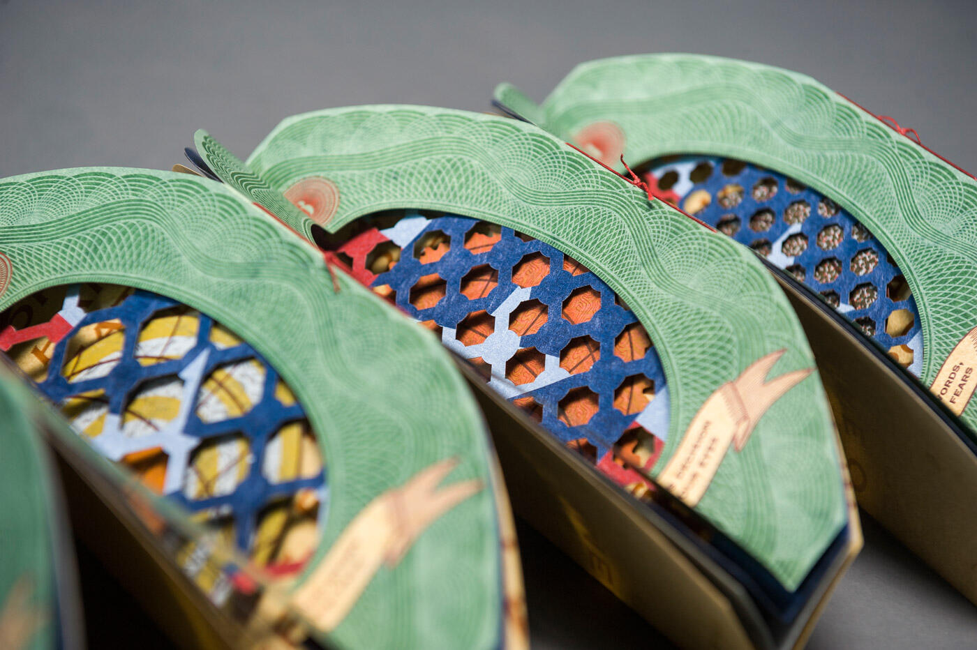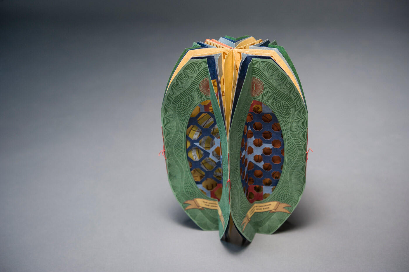 The piece is an example of a sculptural artists’ book, Prasertwaitaya said. “It’s not meant to be read as a book,” she said. “It’s more meant to be viewed as an object of art.”