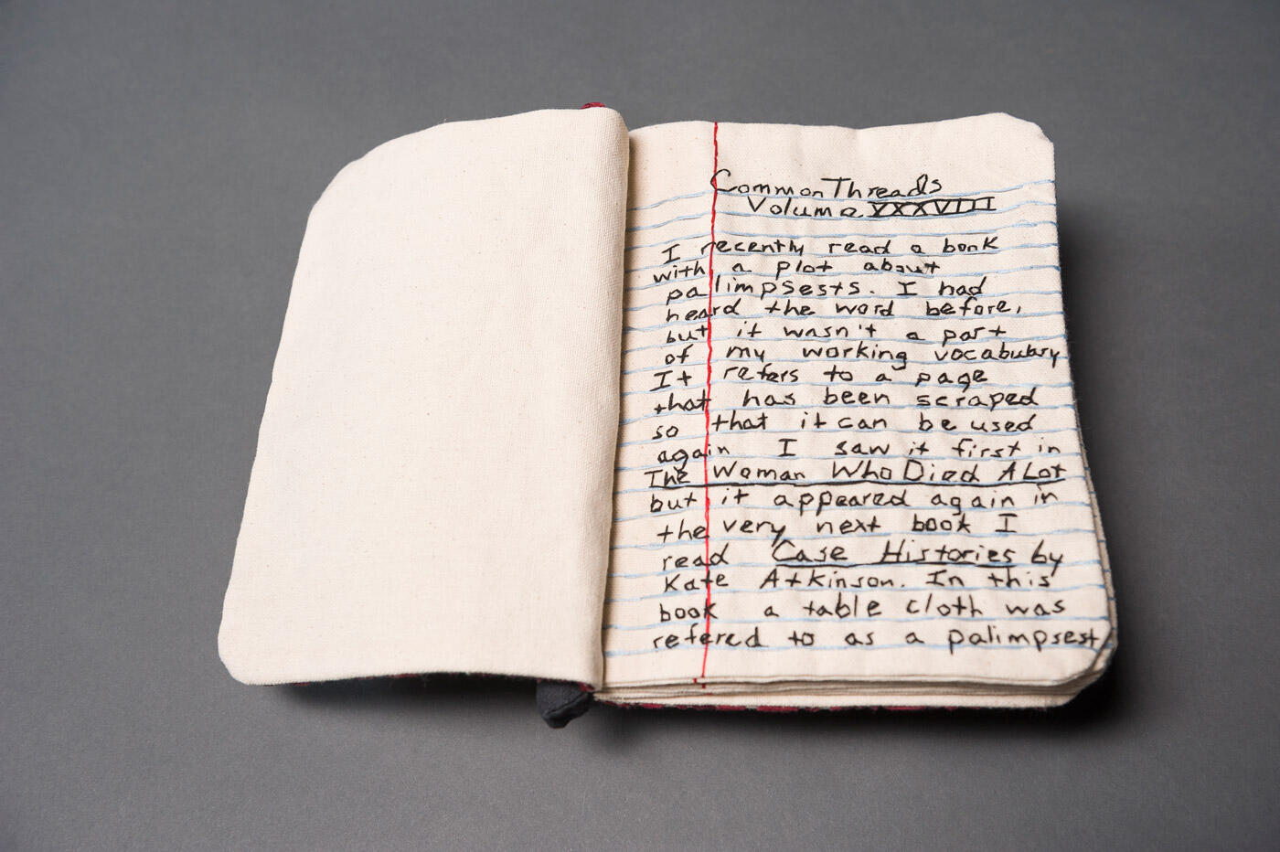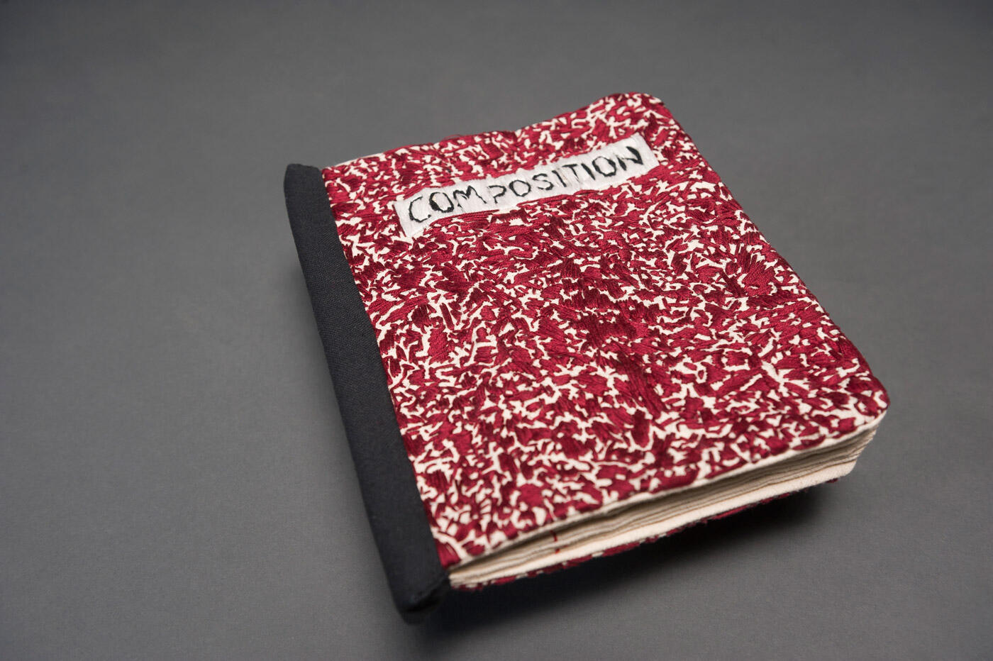 This book is part of a series of hand-embroidered canvas books that copy the form and design of composition notebooks.