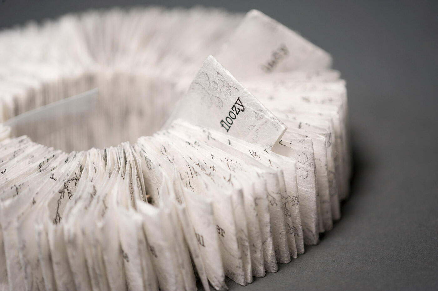 “Cuff,” which is shaped like a cuff that might be found on a woman’s Renaissance dress, features bound fabric pages that have 100 labels for women, some of which are favorable (such as beauty, lady and damsel) and others of which are derogatory (such as cow, old maid and witch).