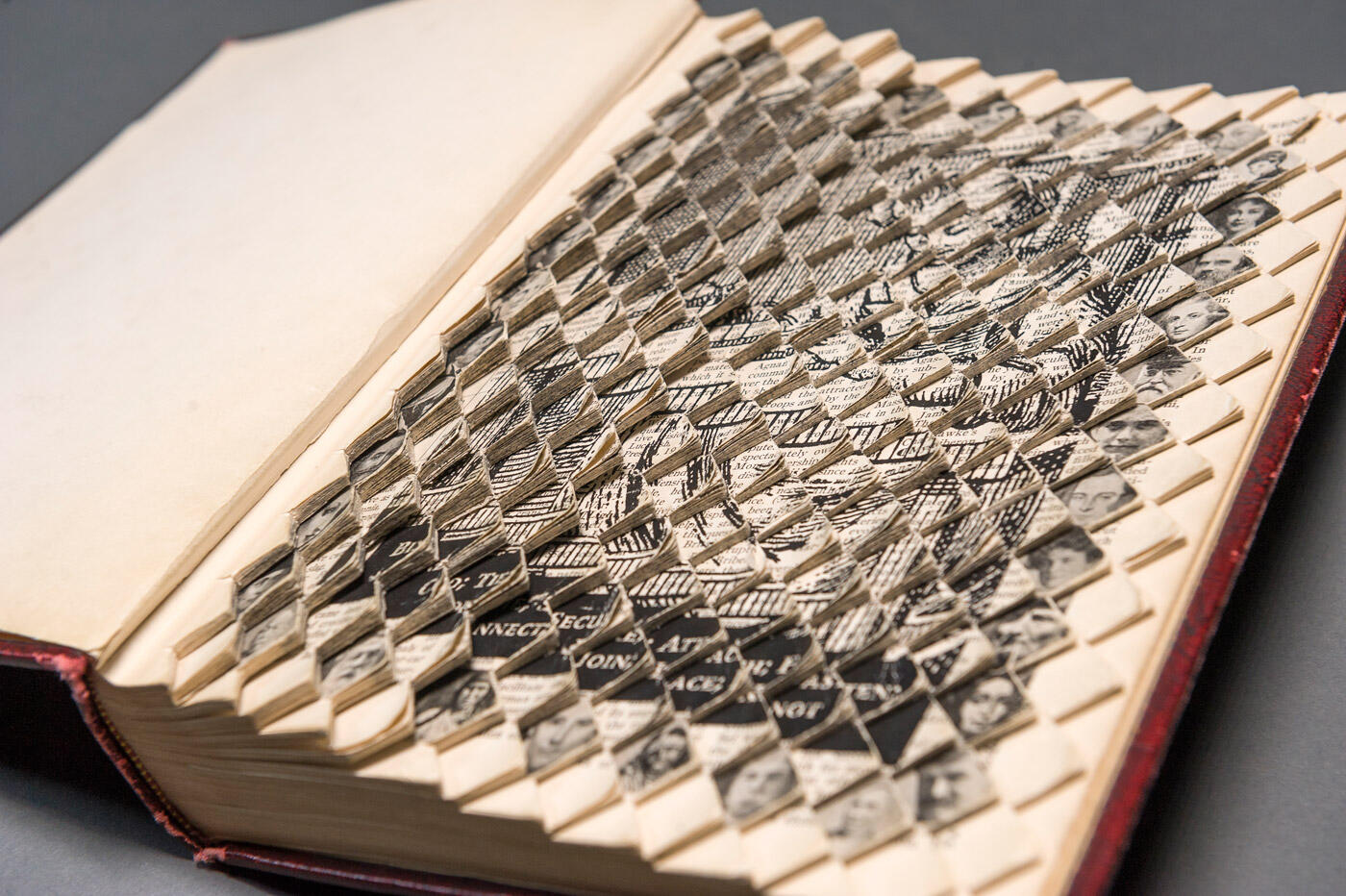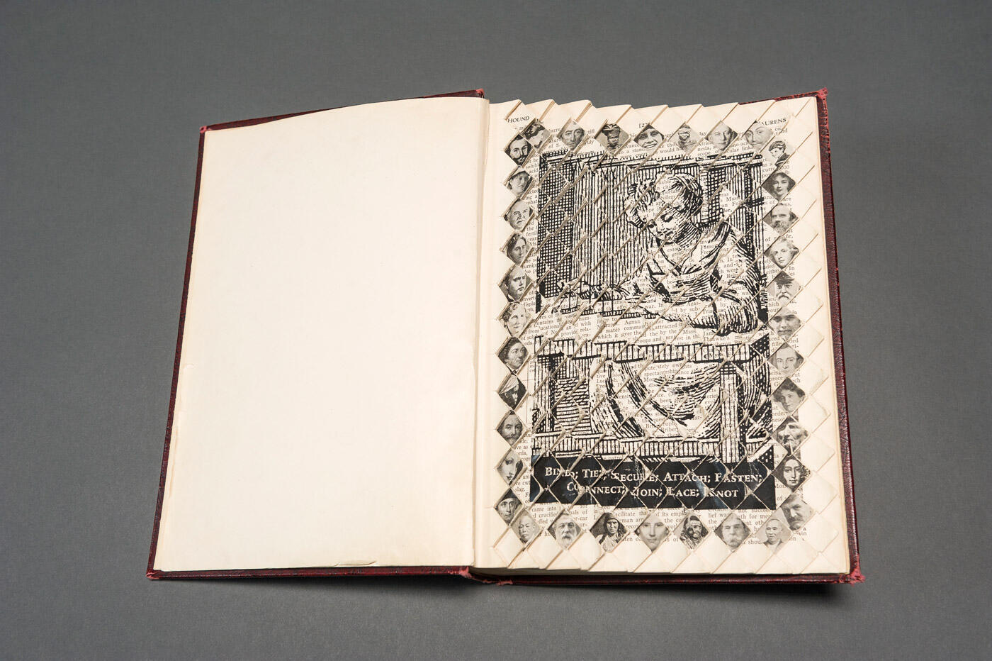 Scott McCarney, who received a degree from the School of the Arts in 1976, created this artists’ book by carving a 20th-century Doubleday Encyclopedia to reveal images of workers representing the book trades from Diderot’s 18th-century “L’Encyclopédie.”