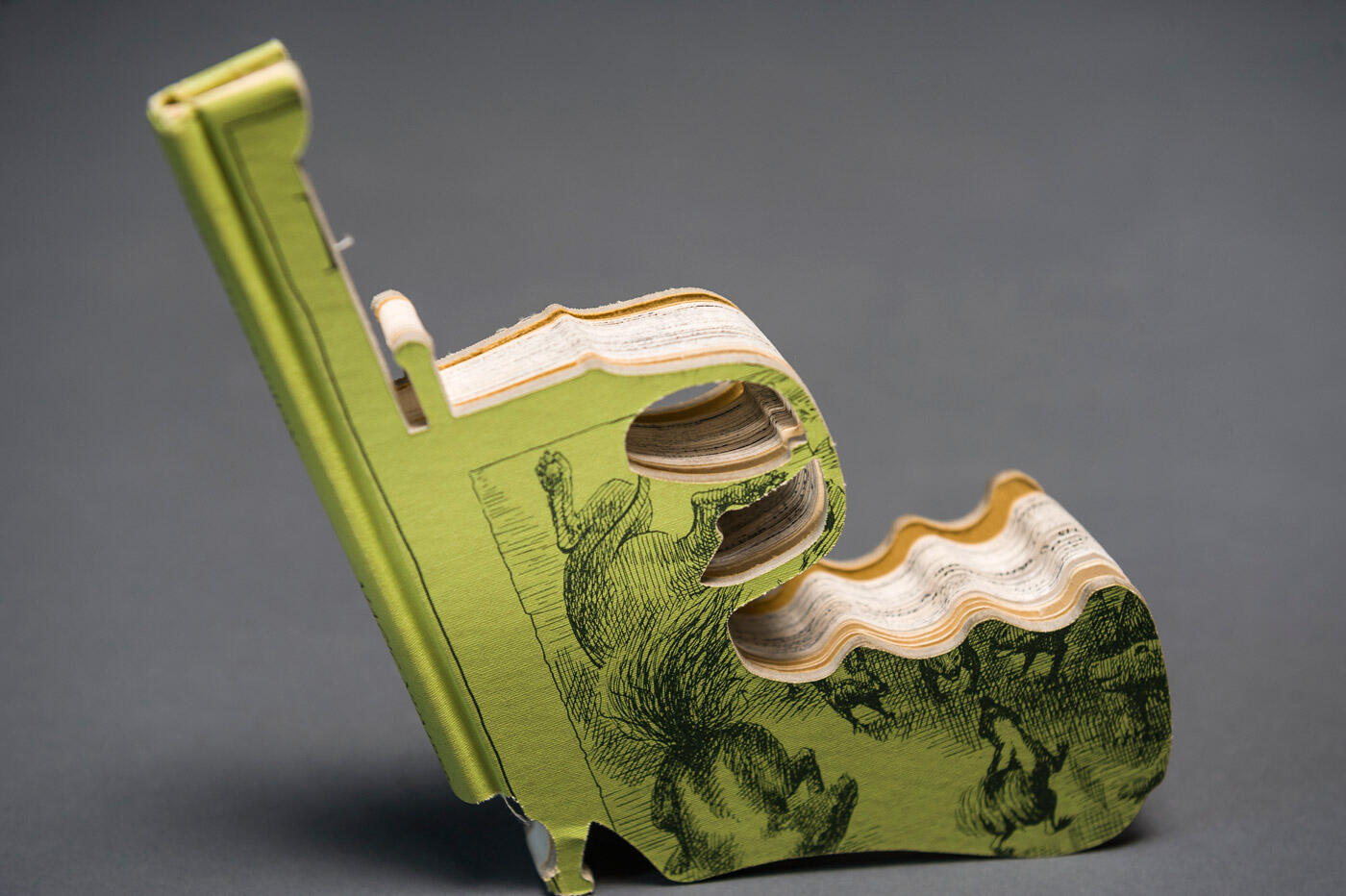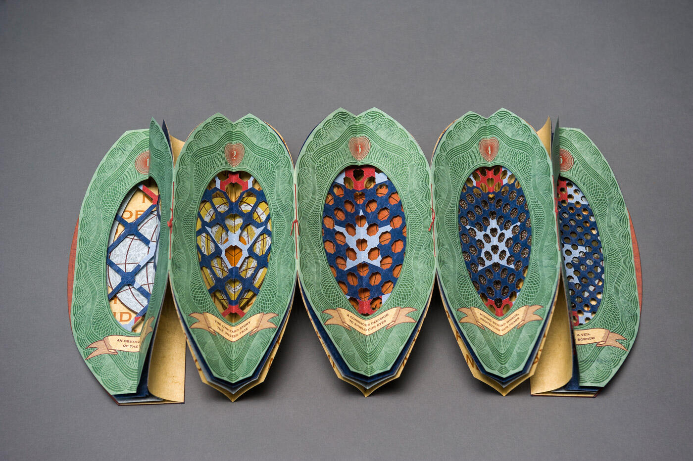 A book carved into the shape of a handgun. A pop-up book that unfolds into a colorful explosion of Chinese food. A double-page spread depicting a forest scene that appears only under ultraviolet light. A hand-embroidered composition notebook that meditates on the etymology of words.