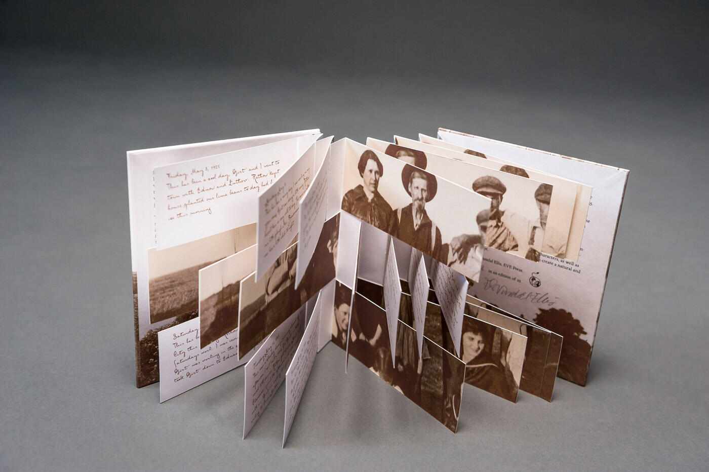 The piece is an example of a “flag book,” which features individual “flags” that are glued into an accordion structure. “You can read it page by page as a book, or open it as a spread, to see one image made up of multiple pages,” Hibben said.