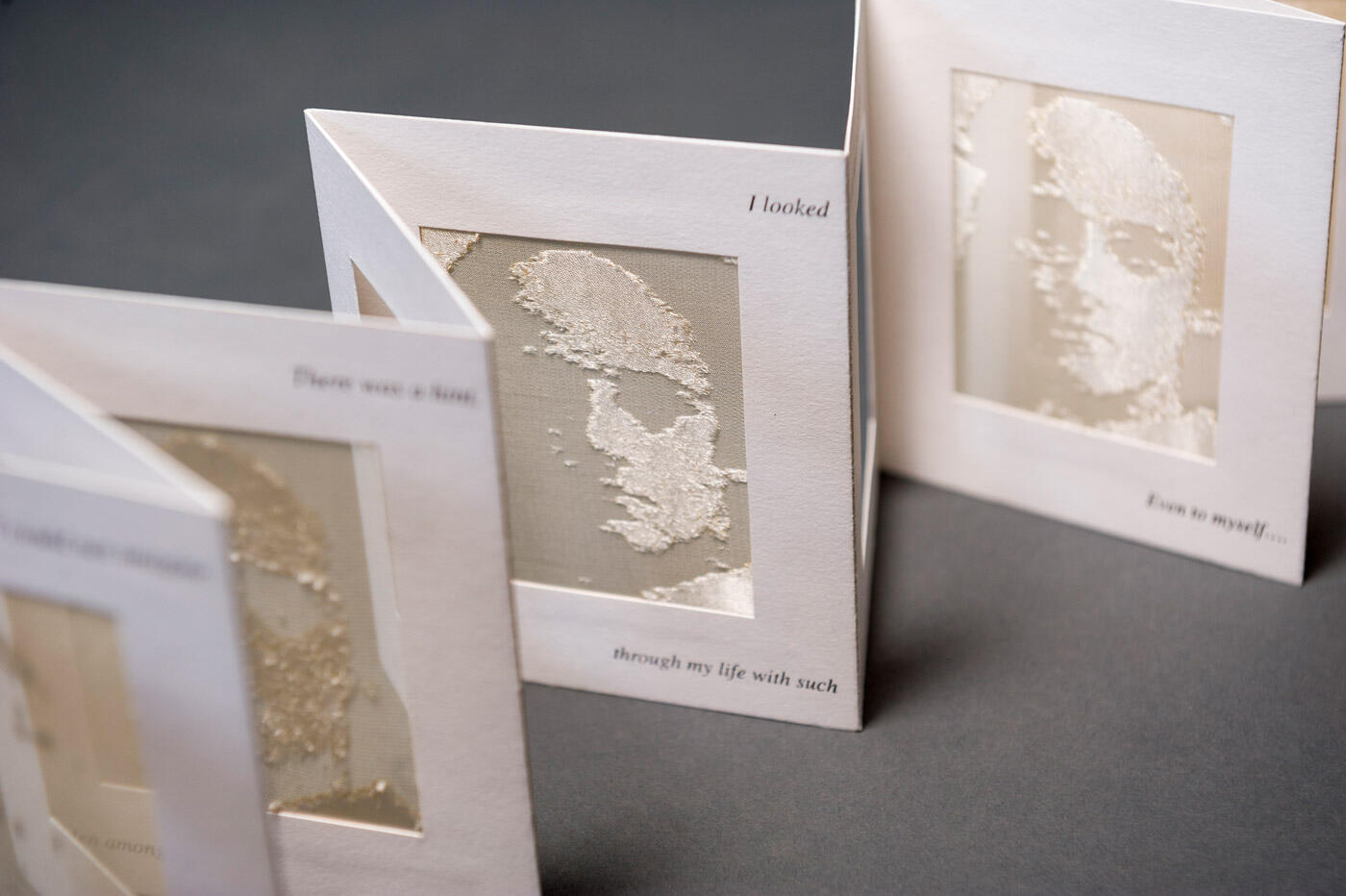 “It’s about self-discovery. It’s a study of identity,” Hibben said. “The images of a face are barely visible on some pages, and sharper on others.”