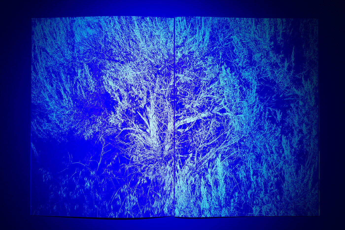 “I enjoy the idea that when a viewer first encounters the book it appears to be blank. Indeed, this notion of the ‘invisible book’ was an important starting point for the work,” Reed told the Booklyn Artists Alliance. “And in this, ingrained in the book itself, are two very concrete ways to experience the book: as a set of blank pages and then, with the help of an ultraviolet light source, a completely radical way of looking at pictures. My intention is to have this process lead a viewer to perceive the imagery less representationally and more sculpturally.”