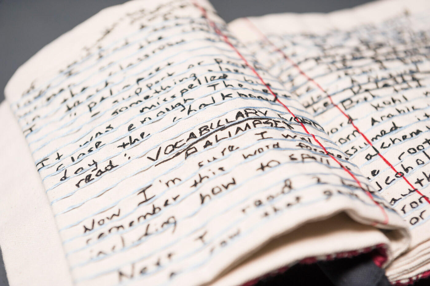 The artist, Candace Hicks, who is part of the Bookyln Artists Alliance, sewed every line, letter and illustration