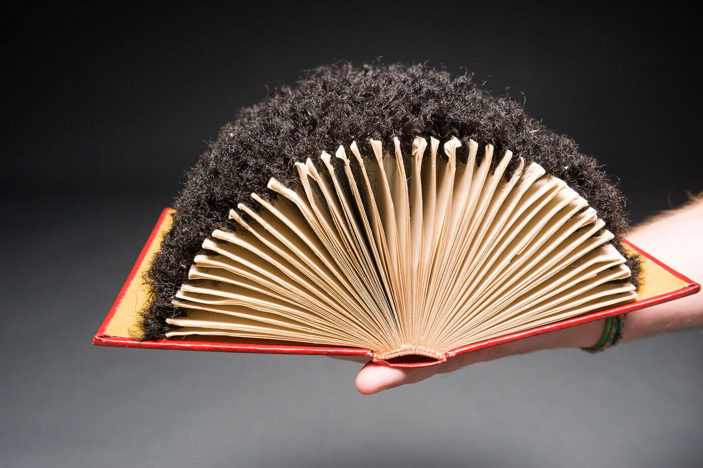 “Edges” is part of a series of altered books that feature hair crocheted onto the edges of the books’ pages.