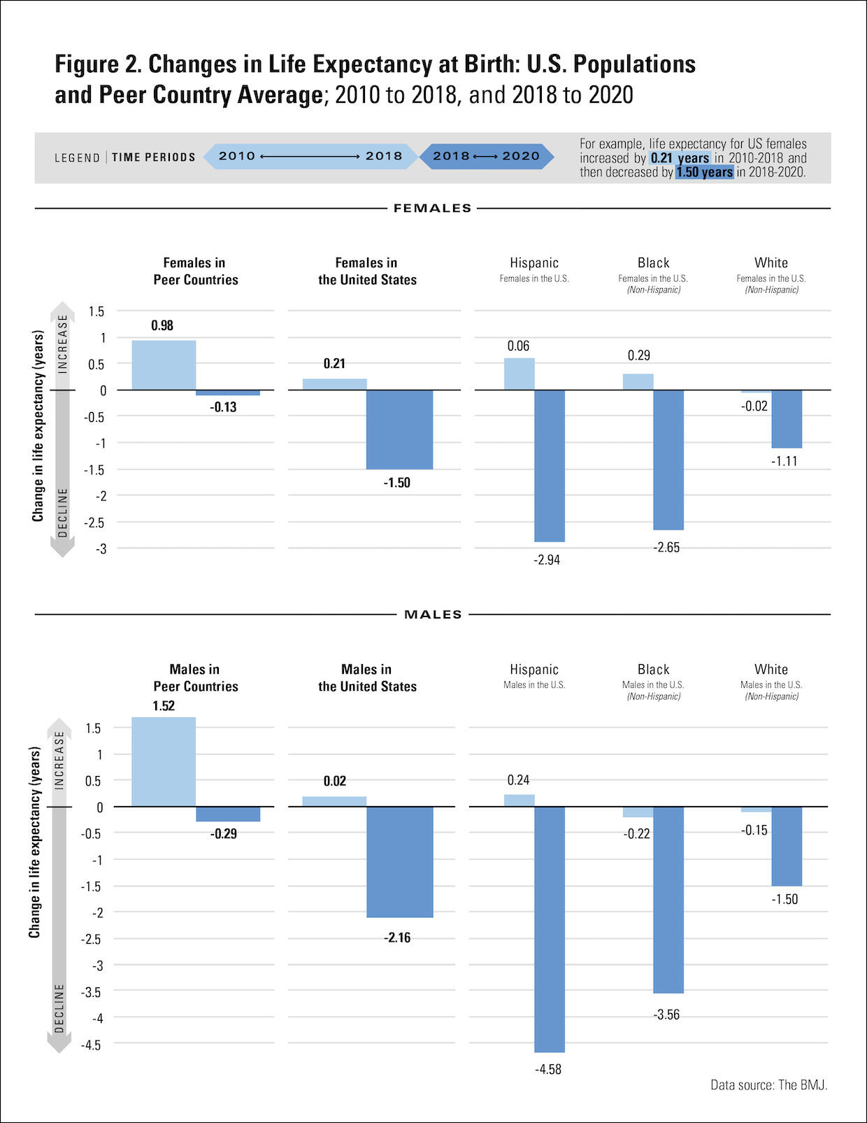 Other countries also saw declines in life expectancy between 2018 and 2020, but the loss of life expectancy in the U.S. was 8.5 times that of the average for 16 peer countries. The declines for minority populations were 15 to 18 times larger than other countries.