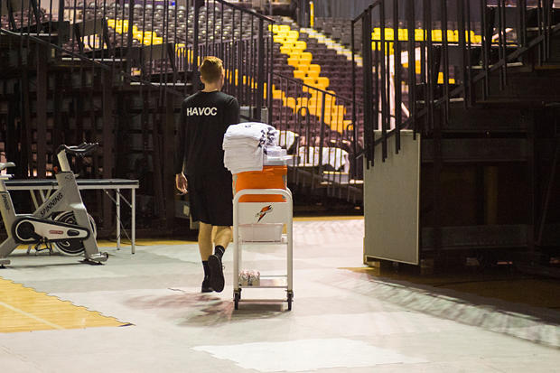 Someone tests the technology at the scorer’s table. A man pushes a cart stacked with shelves of food around the concourse. Near him, the rattle and clang of a kitchen at full throttle is faint through an open door. CBS Sports Network members fiddle with the cables – there are miles of them – that are coiled like thick black snakes behind one of the basketball hoops. Other members of the CBS crew perched above the scene shift their camera from side to side, readying for the real action.