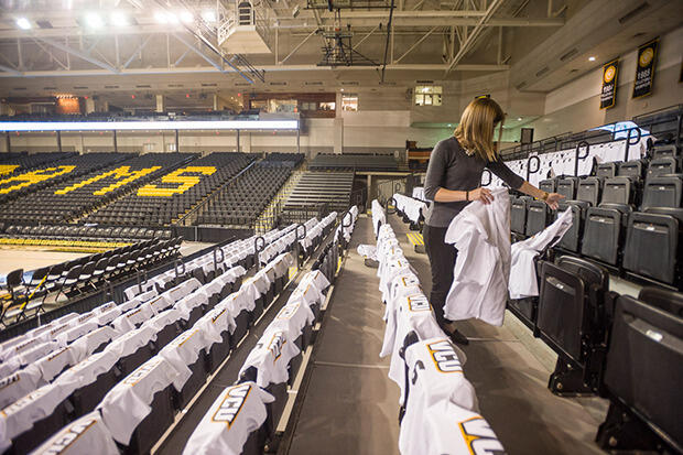 Rebecca Lynch spreads T-shirts with the No. 6 on them – symbolizing the fans’ role as VCU’s sixth man at home games – in the student section.