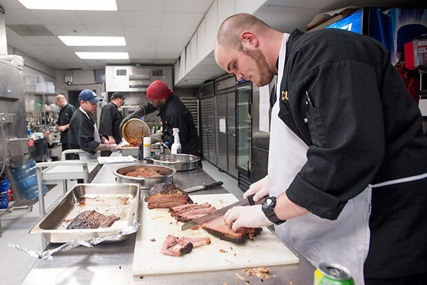 In the Siegel Center kitchen, Chad Healand slices brisket that will be served during the game.