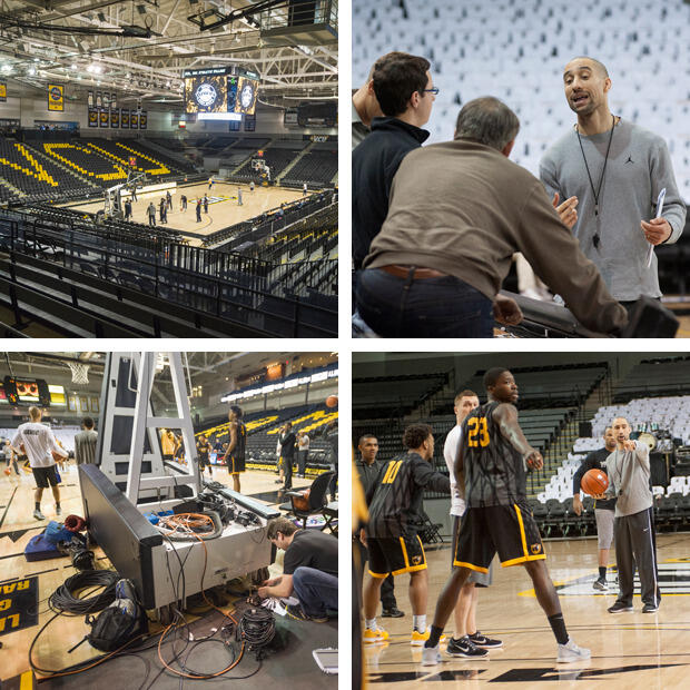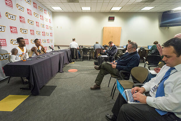 The Rams hold a gameday practice. Afterward, while a handful of players get in some extra shots, coach Shaka Smart speaks with CBS staff to give them insights that can inform their broadcast of the game.