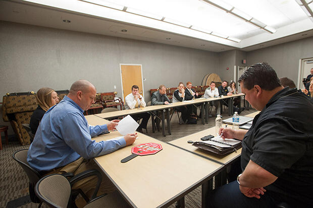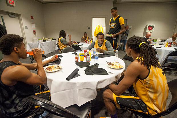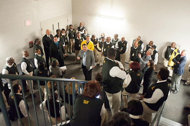 RMC Events employees gather in a stairway to get their assignments and pregame instructions from supervisor Billy Gordon (sport coat). In 2001, 45 RMC Events staffers worked VCU home games. Close to 90 staffers now work the games.
