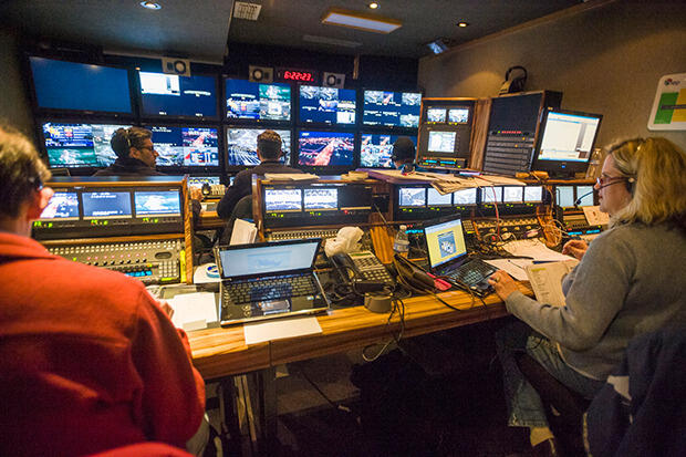 The CBS mobile center is housed in a tractor trailer parked behind the Siegel Center. Ten years ago, television appearances were rare for the Rams and the team did not have a single national TV appearance that season. This season, 24 regular-season VCU games will be shown on national TV. The operation required to put together a single broadcast is extensive, and TV crews routinely need credentials for 35 to 45 people to staff a VCU home game.